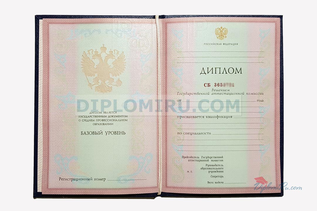 Диплом об окончании указанного ССУЗа в 2011-2013 годах. Бланк «Гознак»